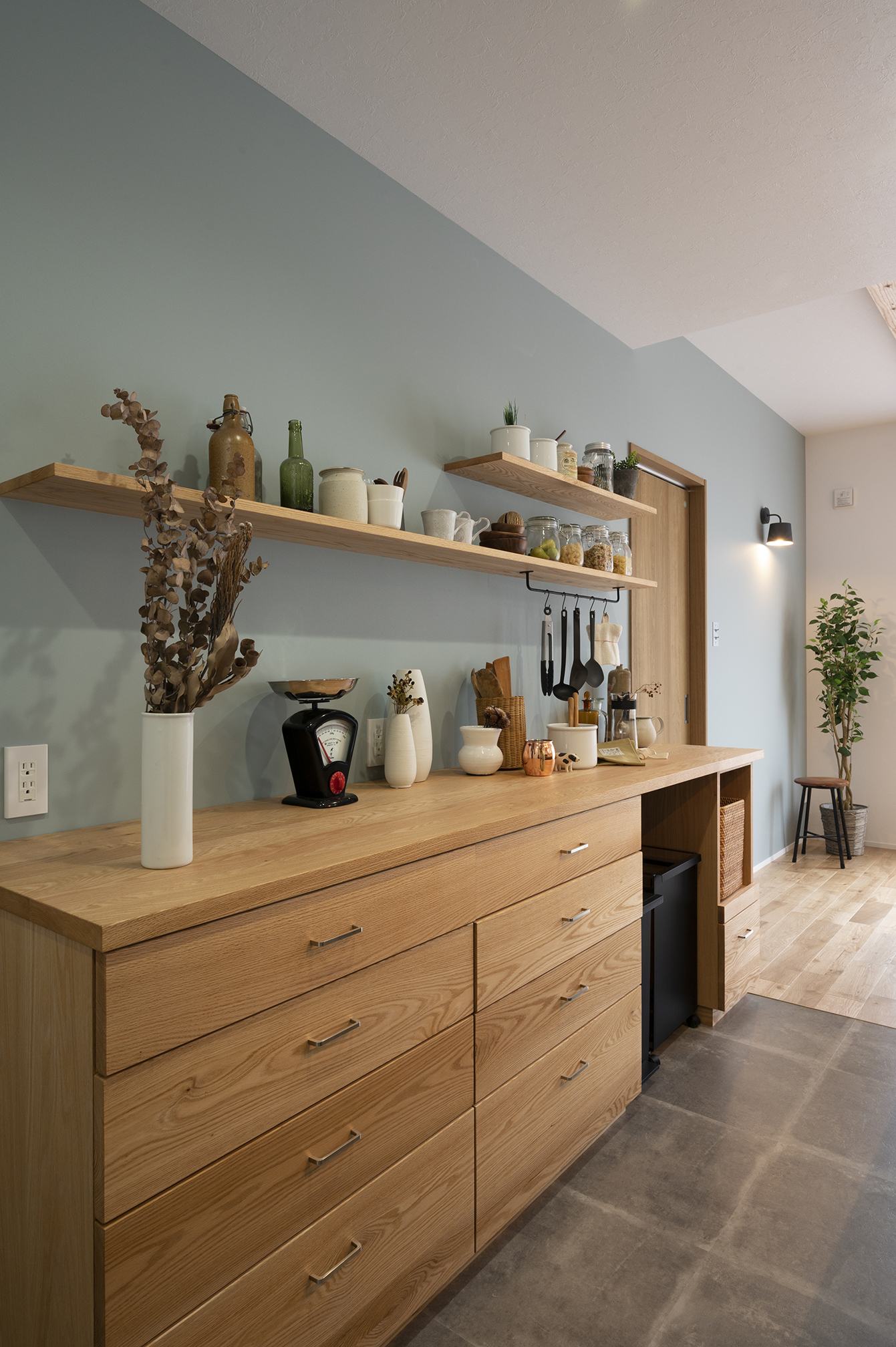木目に合う水色クロスと取っ手のゴールドが上品なアクセント。