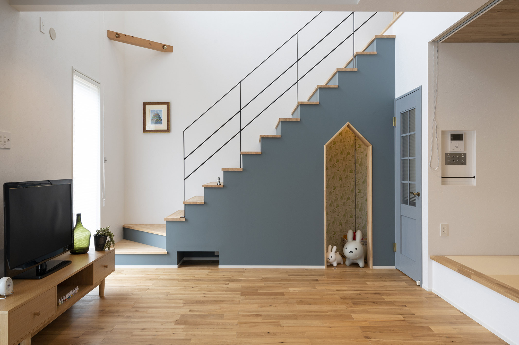 三角屋根シルエットの階段下スペースからちらりと除くムーミンのキャラクタークロスが可愛すぎる。