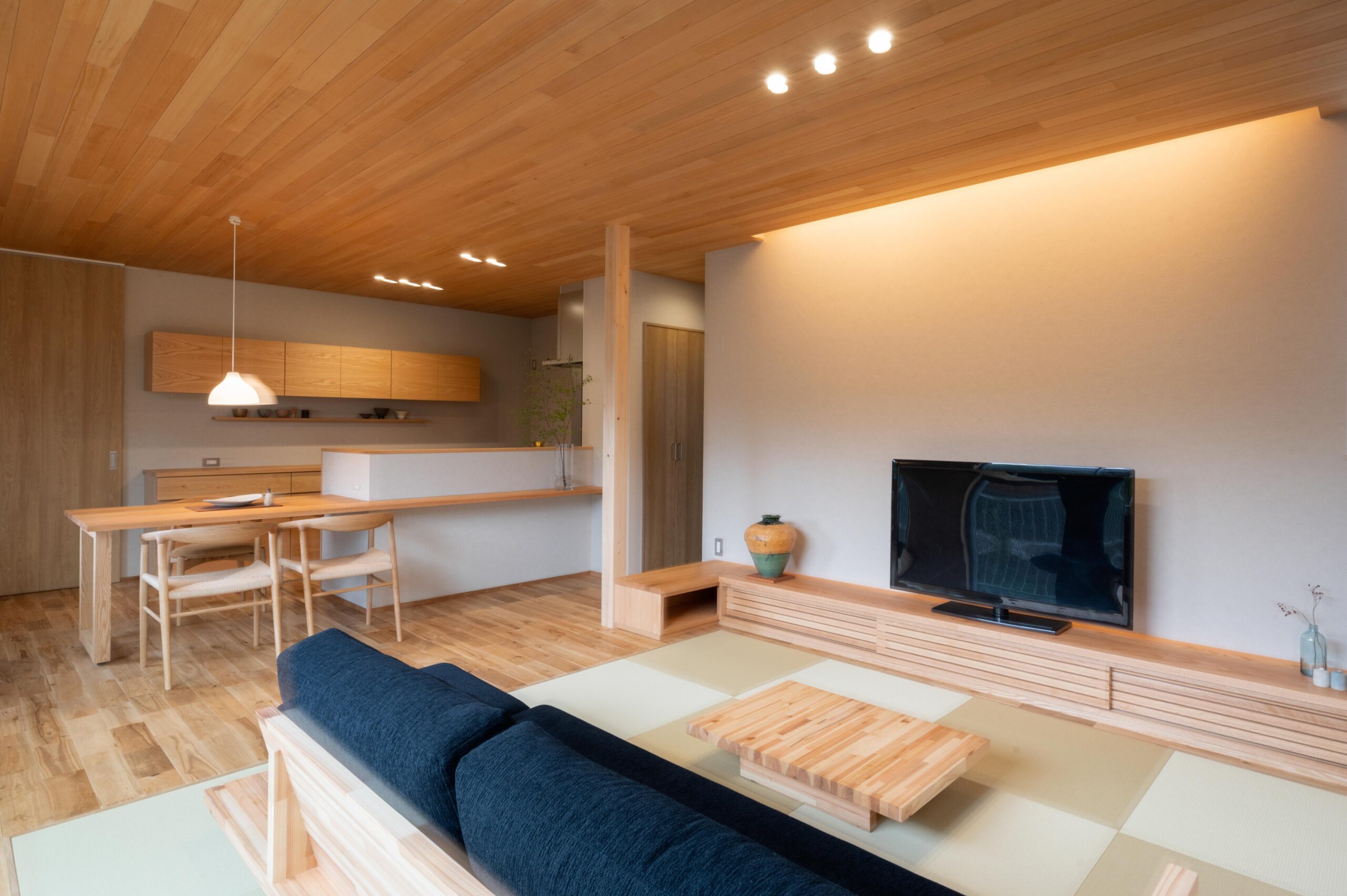 吹き抜け部分の天井は全面板張りで上質で開放的な空間。