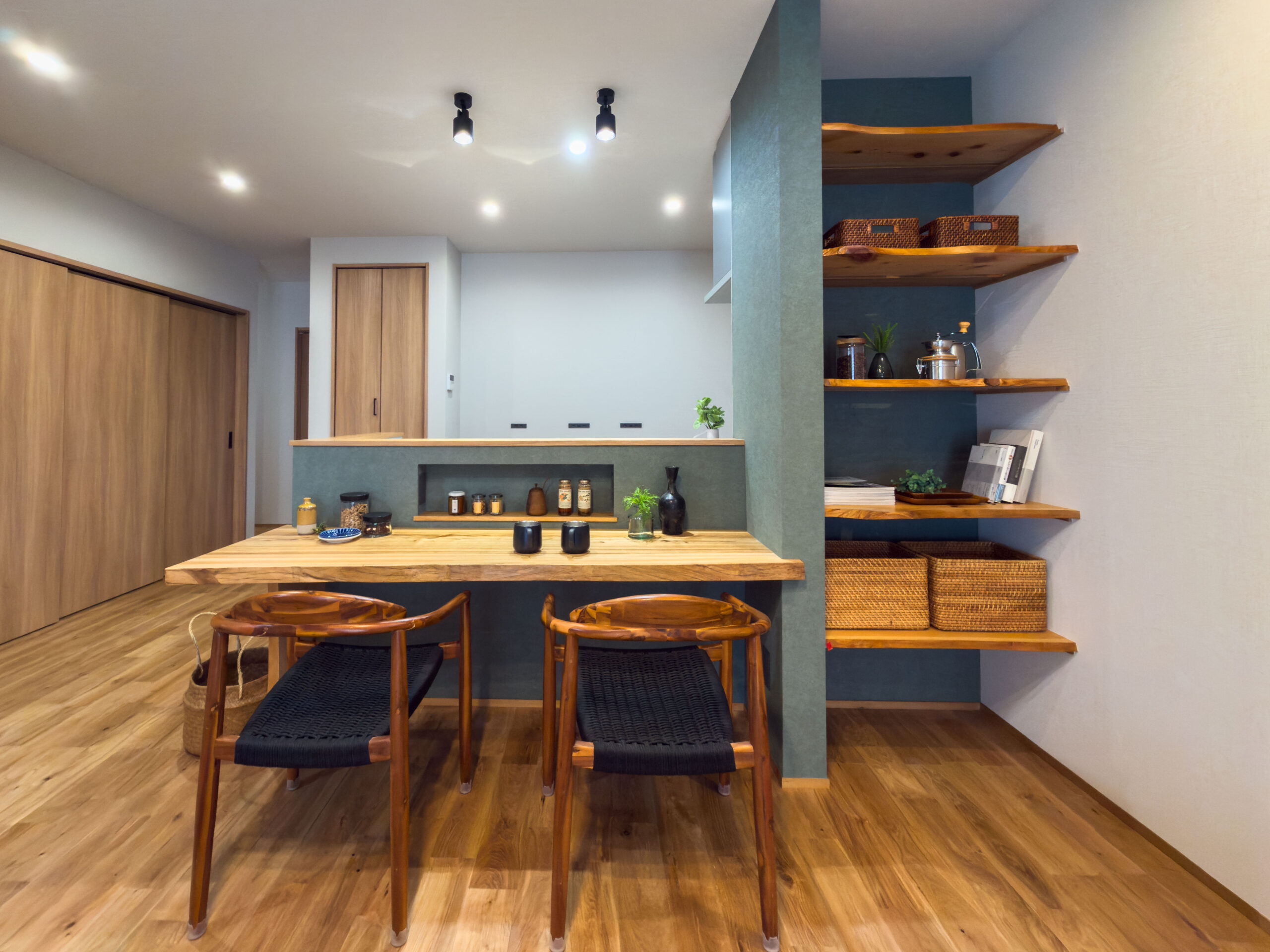 一枚板のカウンターでテーブルいらずの省スペースな暮らし、