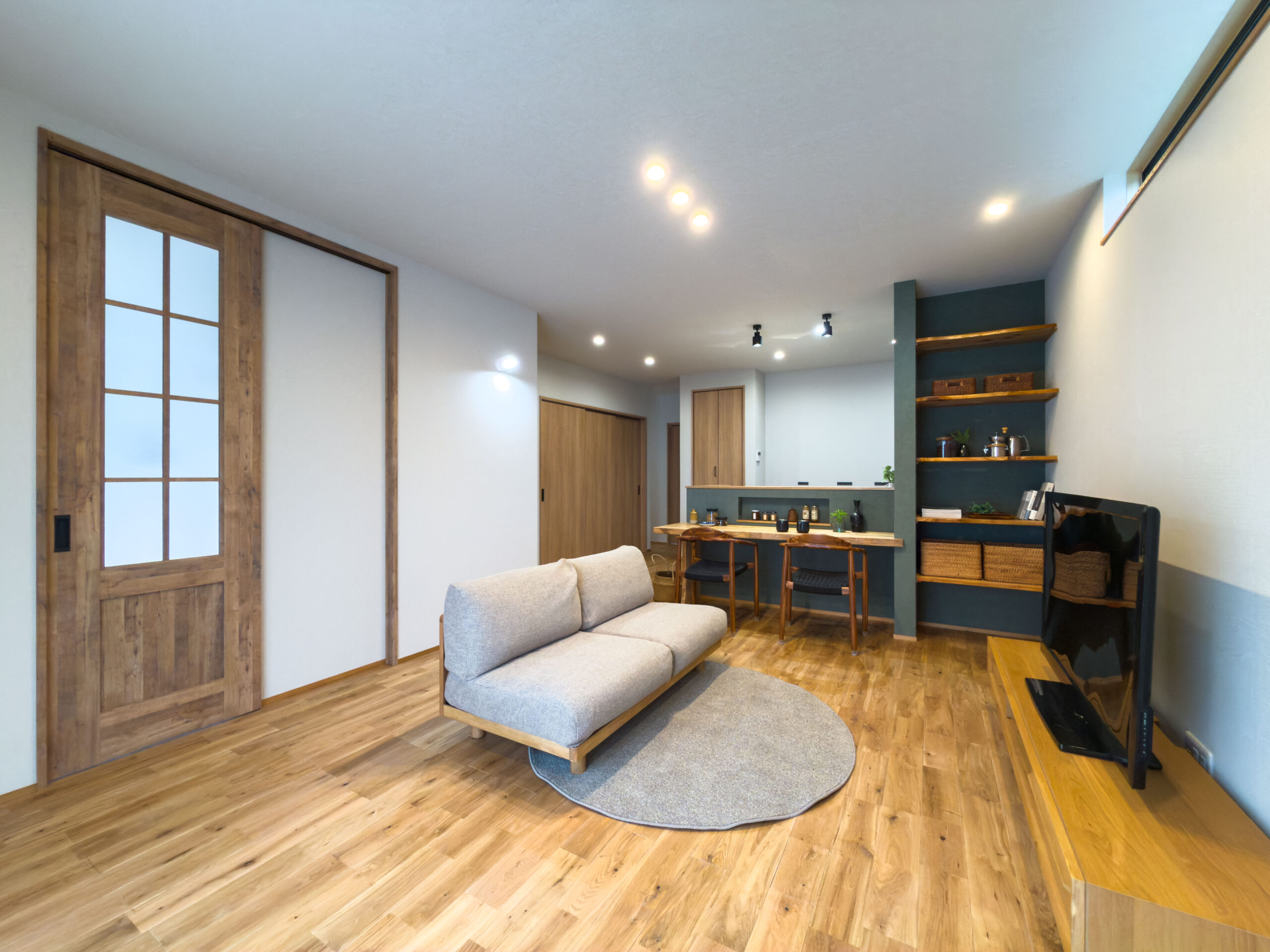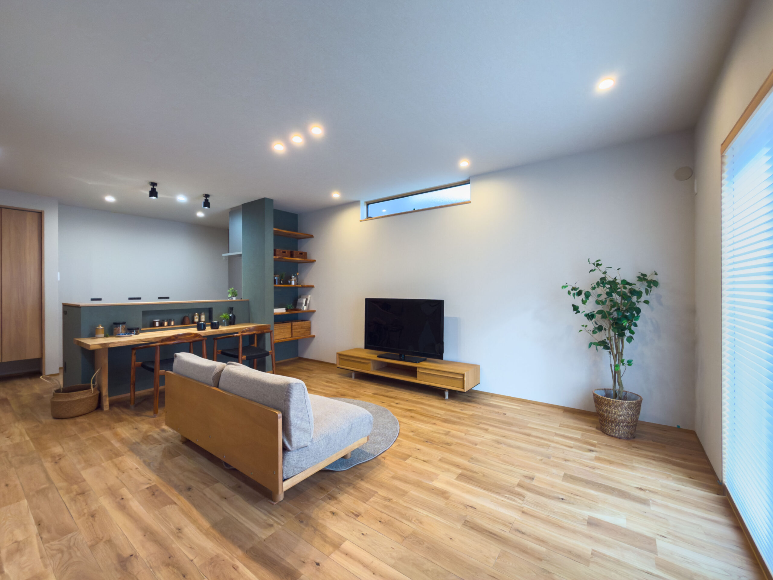 くすみグリーンをちりばめた落ち着きあるデザイン、一直線で家事がラクになる動線、
