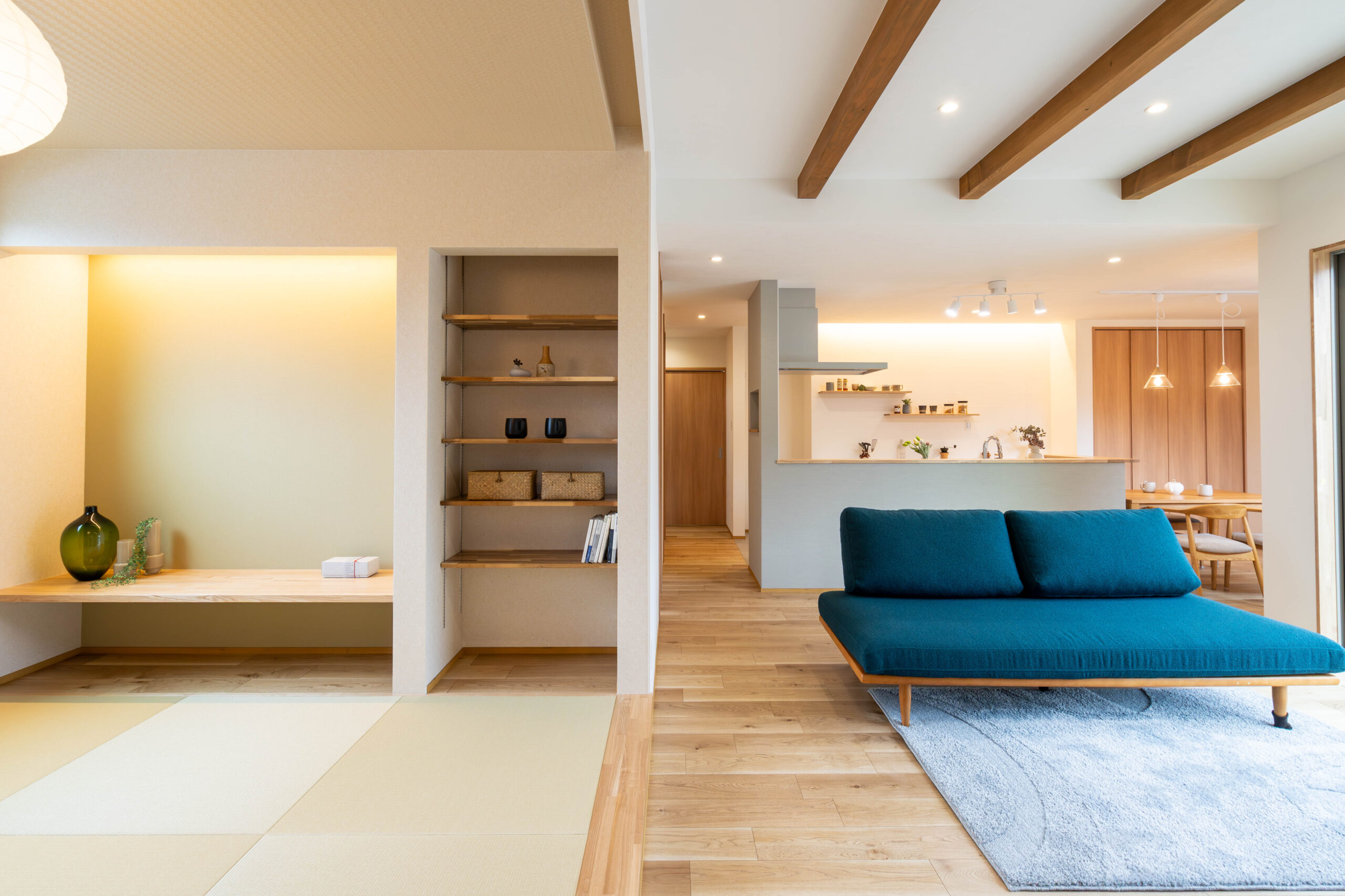 23帖のLDKは、梁見せ天井と間接照明が織りなす開放的な和モダン空間です。