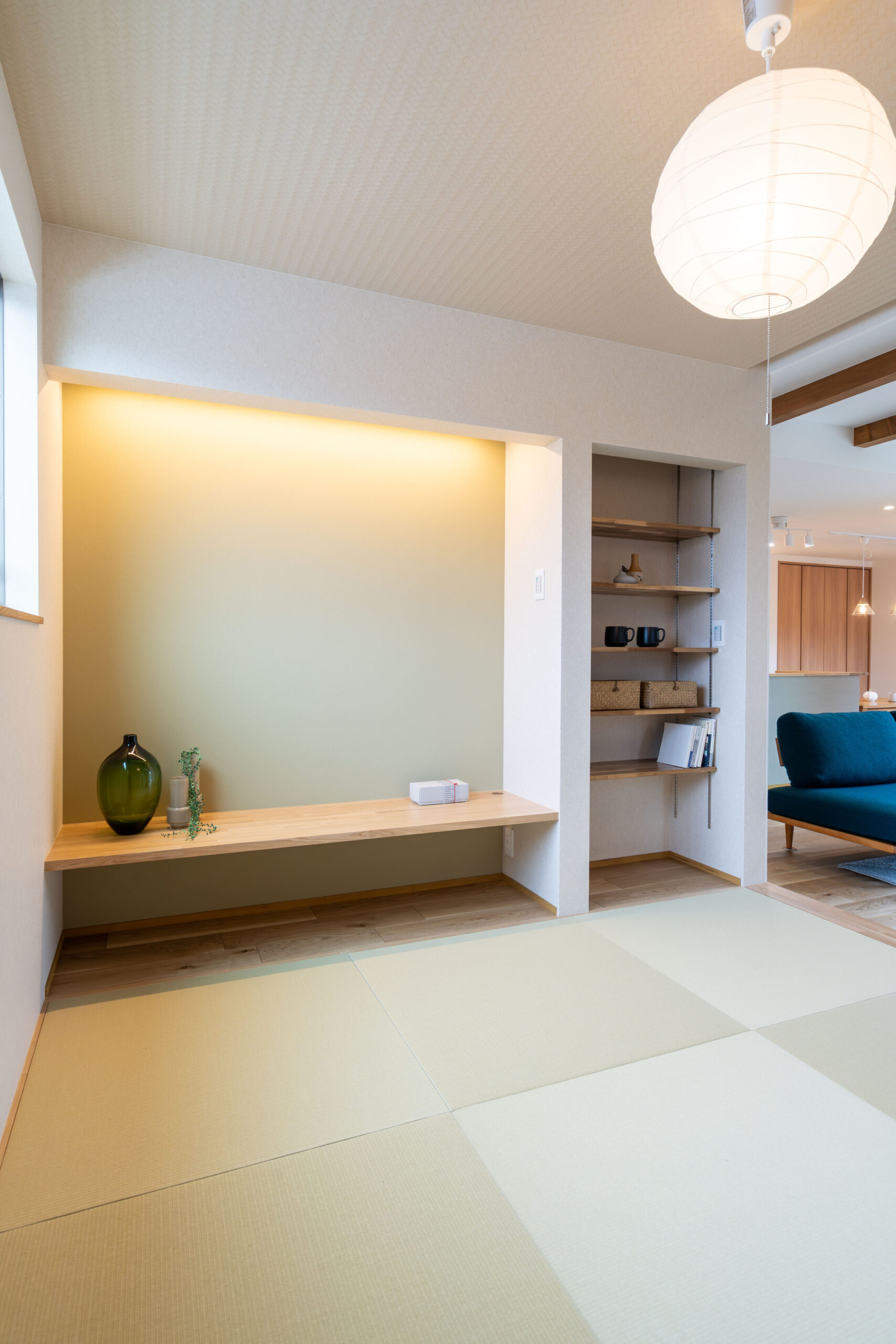 家族が集まるキッチン周りと、ゲストを迎え入れる和室にはこだわりの間接照明を。