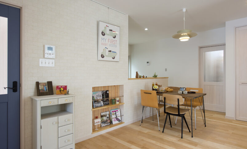 ミントグリーンと白い板壁スタイルが特徴的「室内はかわいく、でも外観は違ったテイストにしたい」リビングと庭がつながる半屋外空間のカバードポーチが居心地のいい空間となりました。