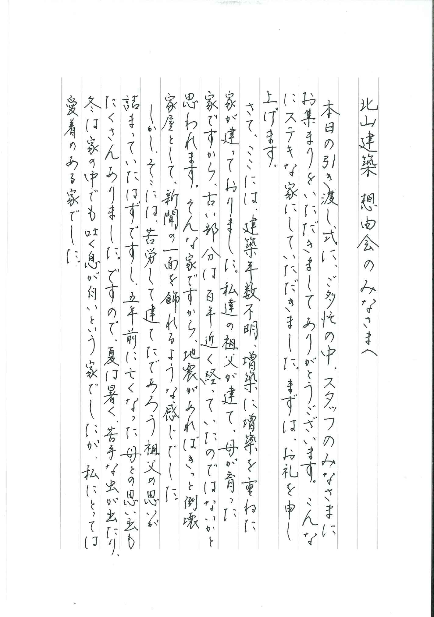 北山建築さん、想由会のみなさんに感謝しながら、これからの時間を丁寧にこの家で過ごしたいと今、改めて思っている次第です。