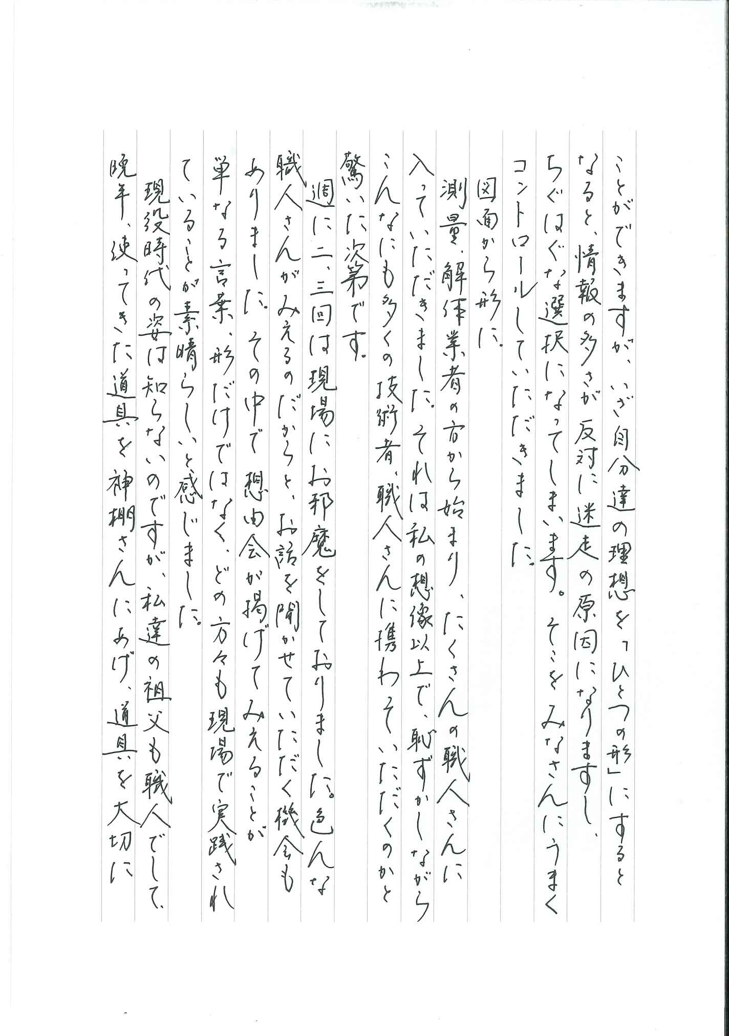 週に二・三回は現場にお邪魔をしておりました。色んな職人さんがみえるのだからと、お話を聞かせていただく機会もありました。