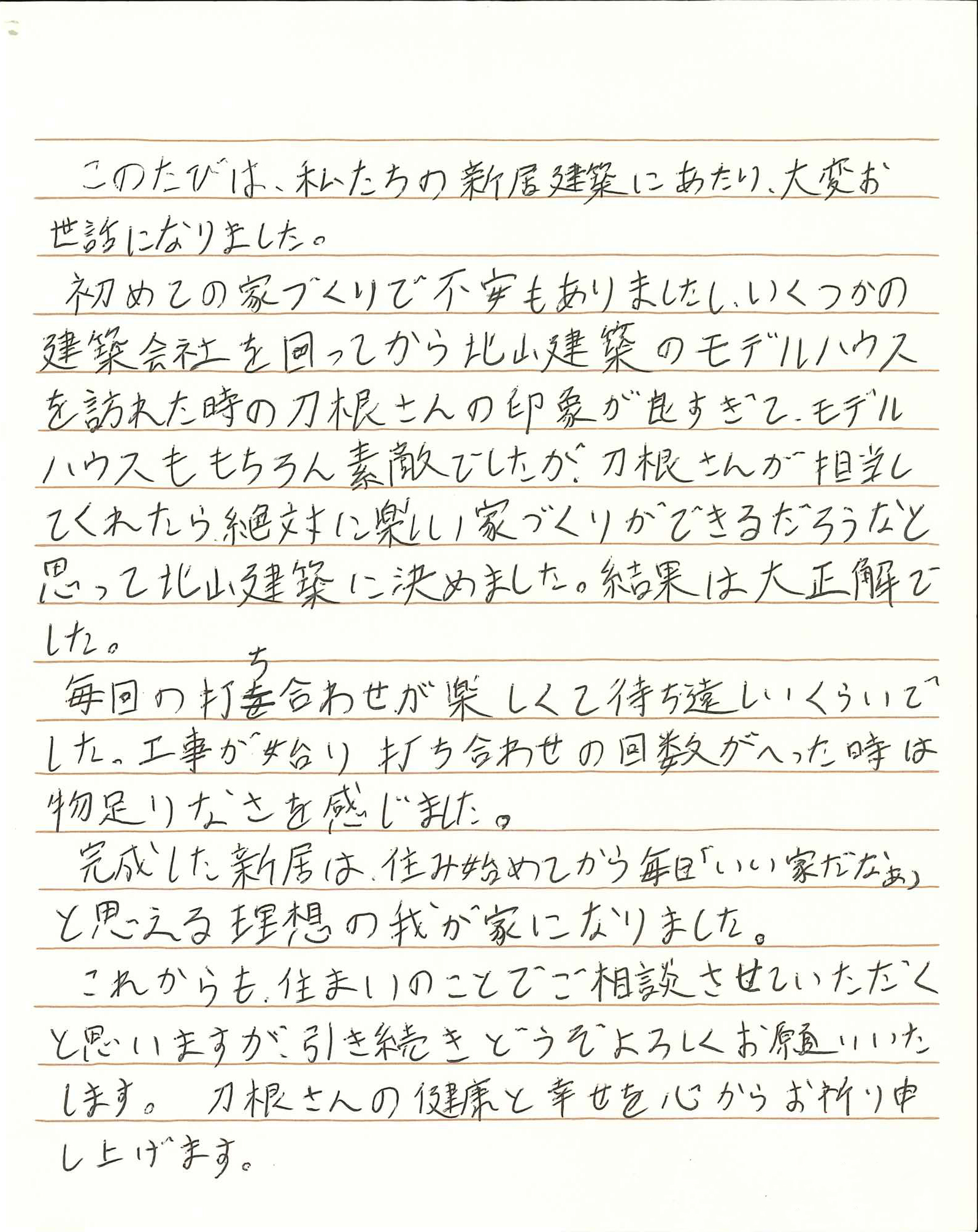 このたびは、私たちの新居建築にあたり、担当の刀根さんをはじめ、
