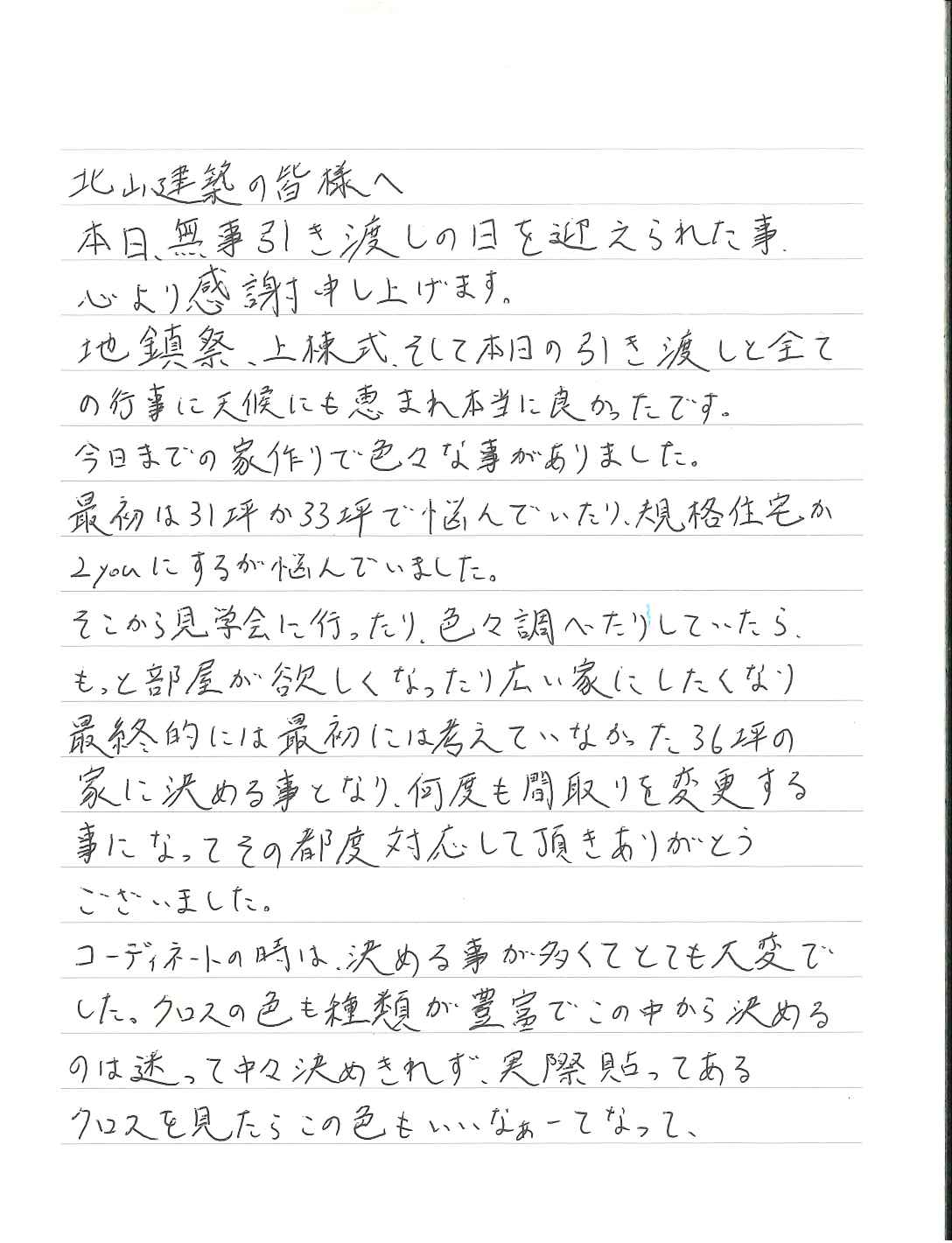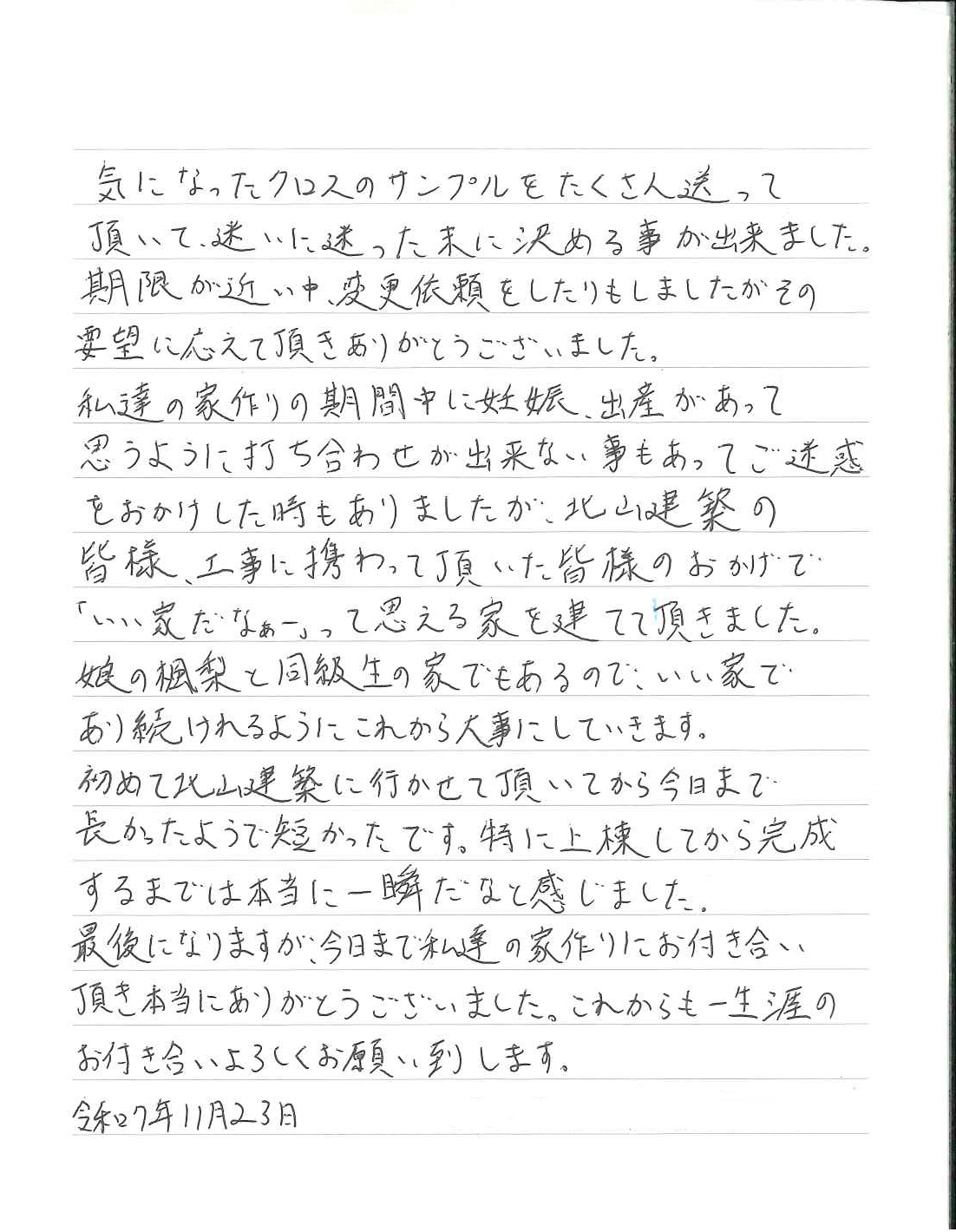 北山建築の皆様、工事に携わって頂いた皆様のおかげで 「いい家だなぁー」って思える家を建てて頂きました。